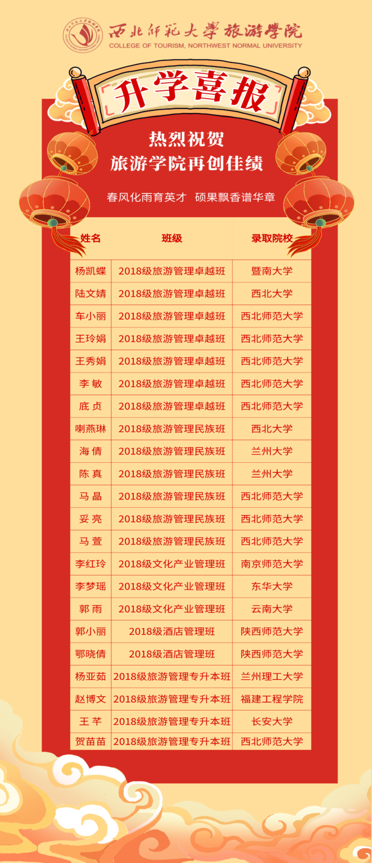 梅花香自苦寒来,宝剑锋从磨砺出。旅院学子用奋斗谱写出自己的精彩华章,用汗水与努力浇灌出成功之花。旅游学院多年来一直坚持以考研为抓手组织学风建设,积极推进服务学生发展机制,强化发展引导和文化育人。组织召开考研动员大会、考研复试指导及调剂咨询座谈会、优秀学生代表考研经验分享会,为考研学子发放暖心大礼包,疫情封控期间为学生协调复试场地等,学院用实际行动积极鼓励学生考研,大力营造考研氛围,为学生全方位发展创造良好的环境。在学院领导、专业导师和辅导员老师的全方位支持和细致化服务下,我院考研上线率不断提高。